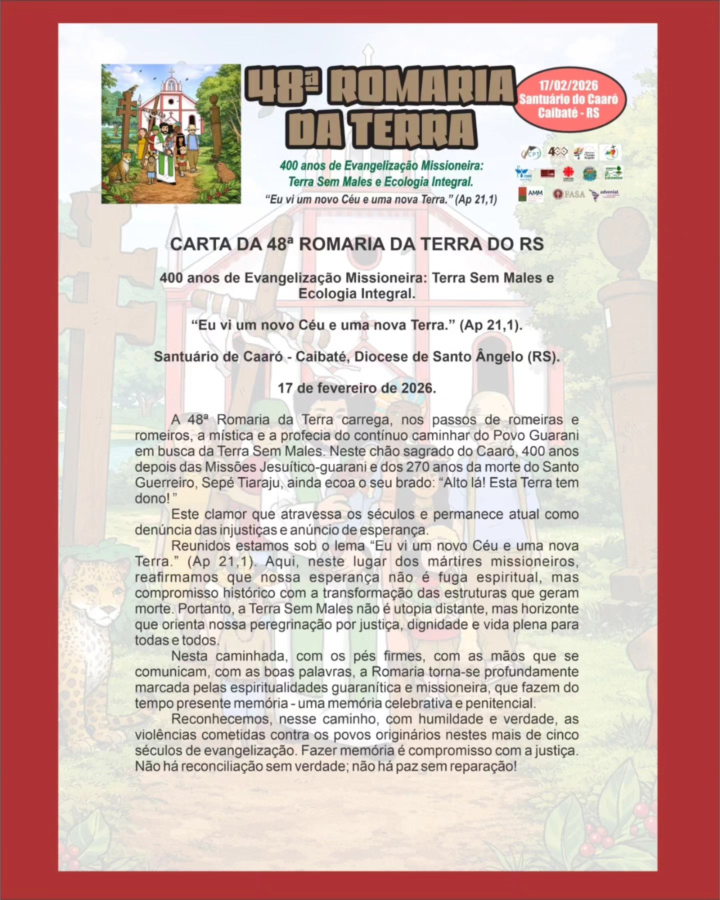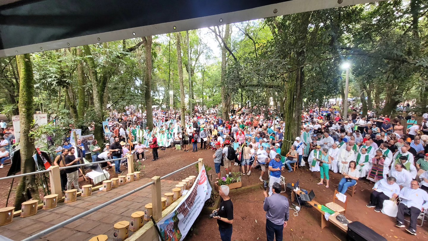 Um dia para ficar na história. Dentro da programação das comemorações dos 400 anos das Missões Jesuítico-Guarani, a Diocese de Santo Ângelo acolheu, na terça-feira de Carnaval, 17 de fevereiro de 2026, a 48ª Romaria da Terra do Rio Grande do Sul. Com o tema “400 anos de Evangelização Missioneira: Terra Sem Males e Ecologia Integral” e o lema “Eu vi um novo Céu e uma nova Terra” (Ap 21,1), a iniciativa propôs uma profunda reflexão sobre a Ecologia Integral e o respeito aos povos originários, reunindo cerca de 5 mil pessoas de diversas dioceses gaúchas.