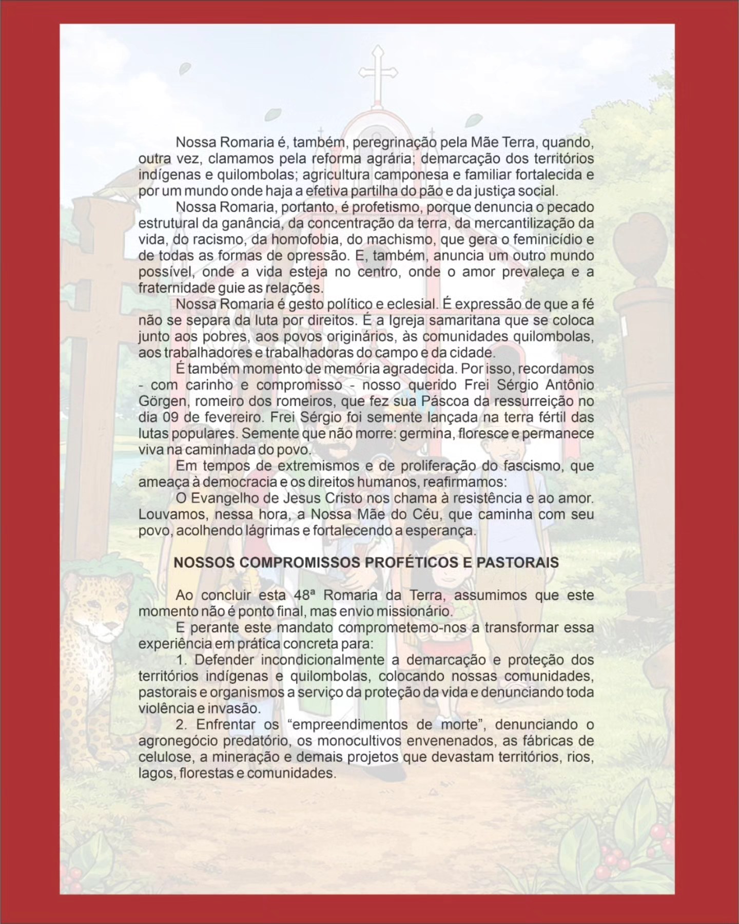 Durante a tarde aconteceram manifestações populares e apresentações artísticas, além da leitura da Carta da 48ª Romaria da Terra. Um momento especialmente significativo foi a homenagem a Frei Sérgio Görgen, com o plantio de uma árvore no Santuário. Frei Sérgio, falecido em 03 de fevereiro deste ano, foi grande entusiasta da Romaria, apoiador dos movimentos sociais e símbolo de resistência na luta pelos direitos dos mais vulneráveis e pela reforma agrária.