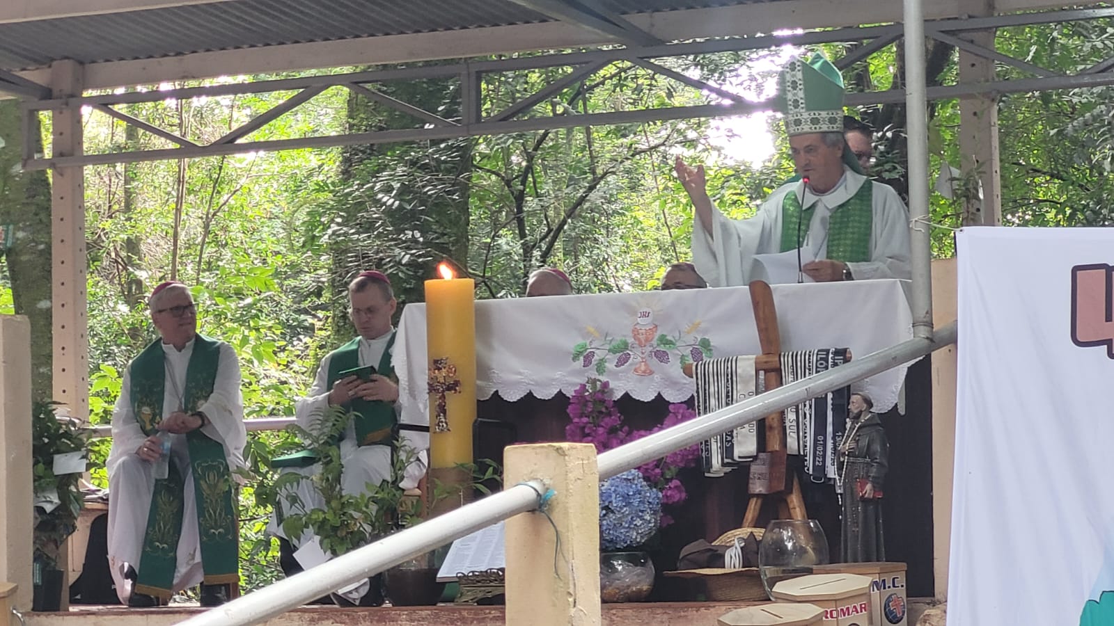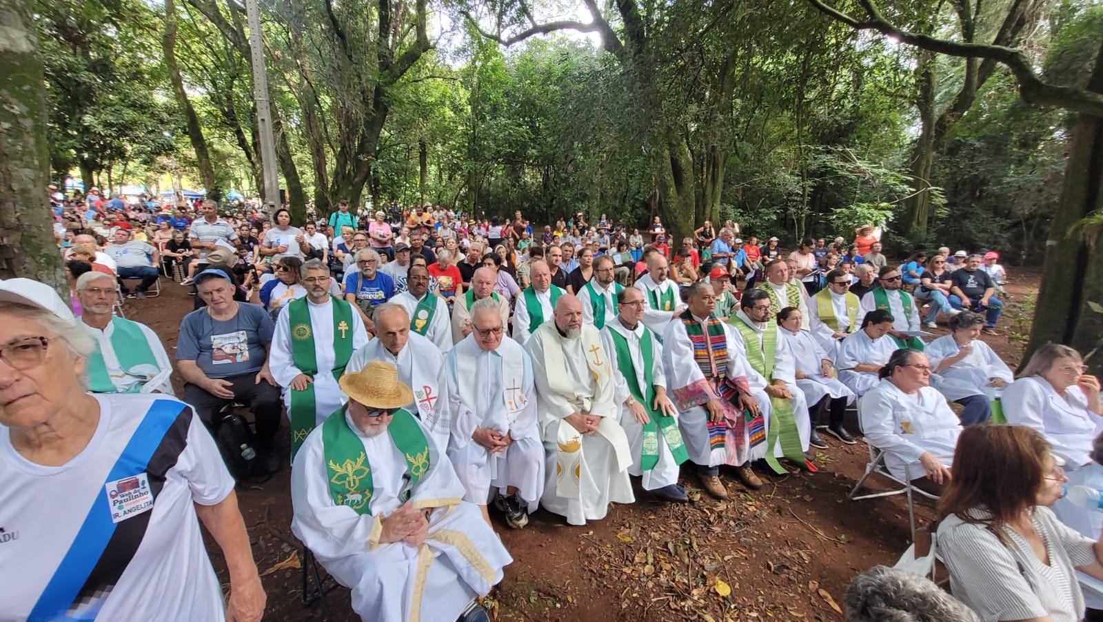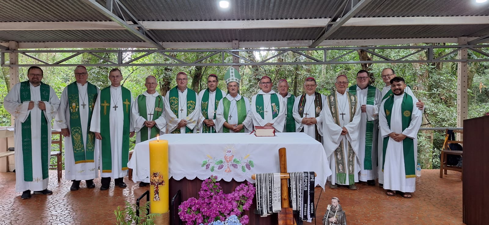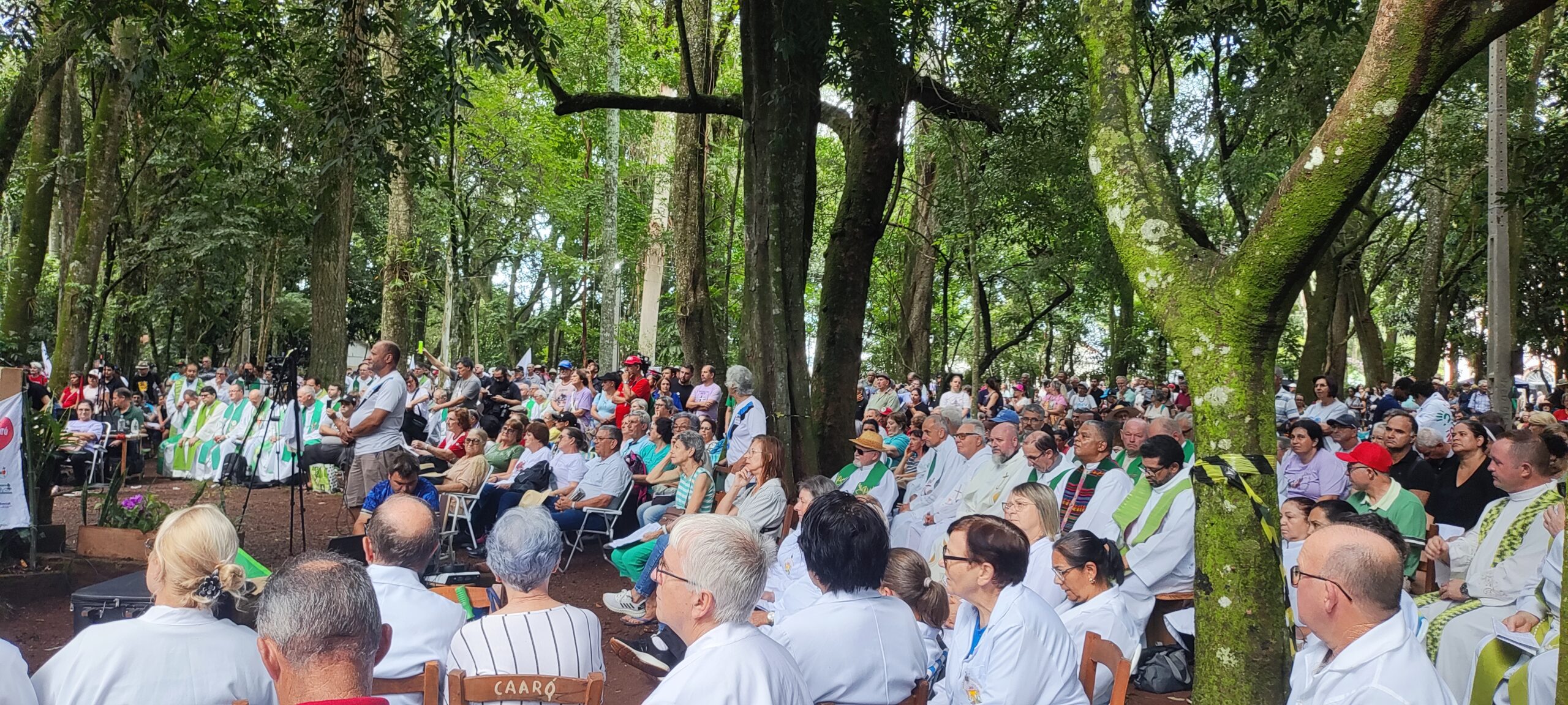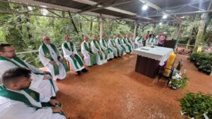 A manhã foi concluída com a Santa Missa no altar do bosque, presidida por Dom Liro e concelebrada pelos demais bispos e sacerdotes presentes. Na homilia, o bispo de Santo Ângelo destacou a vida comunitária como um dos grandes legados das reduções missioneiras — verdadeiro modelo de sociedade sem desigualdade nem pobreza — e reforçou: “O ser humano precisa viver em equilíbrio com a natureza e com os irmãos, superar o pensamento meramente exploratório e viver de forma consciente, sem gerar a destruição dos recursos naturais.”